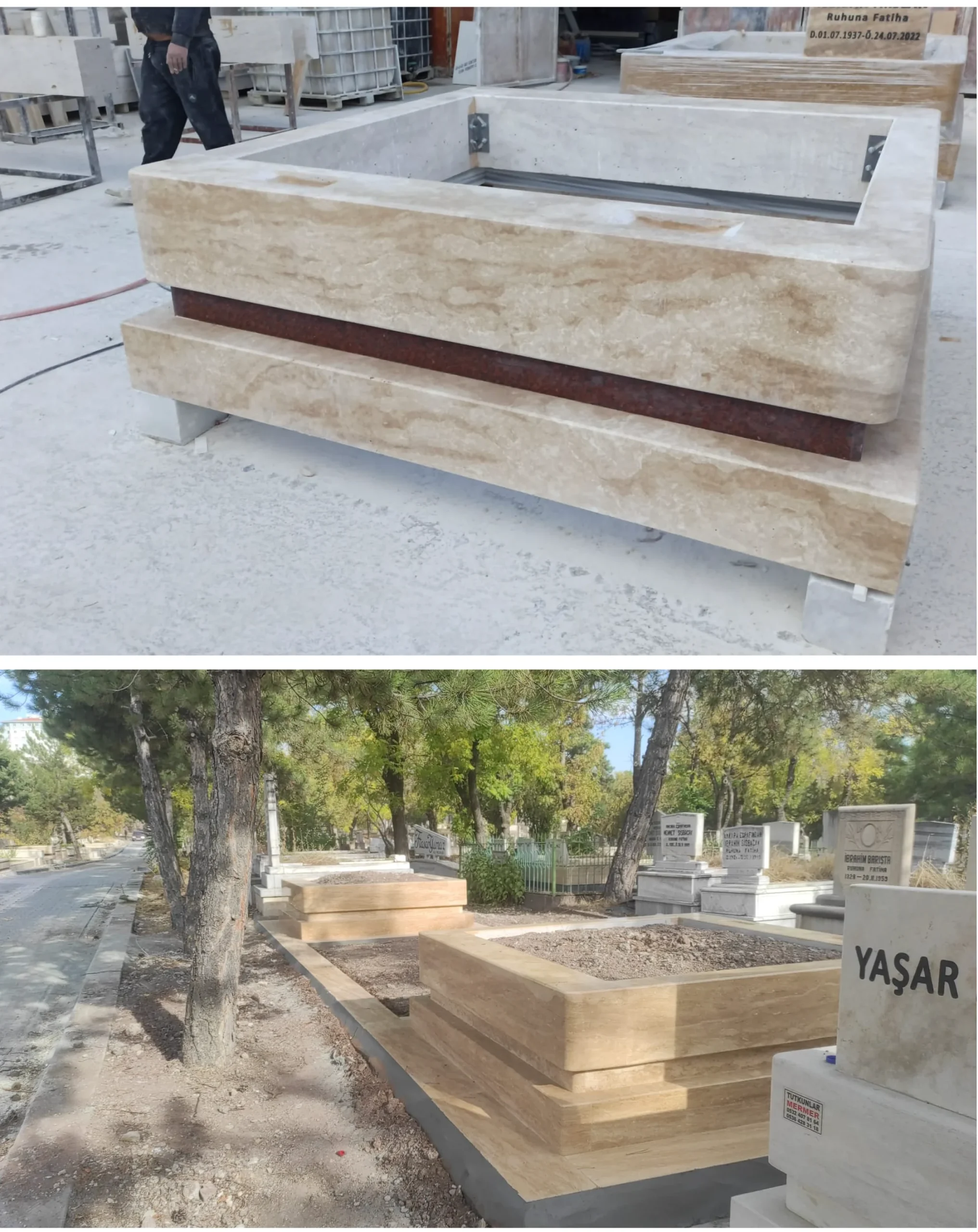 Traverten Malzeme: Traverten, doğallığı ve dayanıklılığı ile bilinen bir taştır. Yıllara karşı direncini koruyan bu malzeme, mezara hem doğal bir güzellik hem de sağlamlık katar. Aynı zamanda farklı renk ve dokularda işlenebilir.